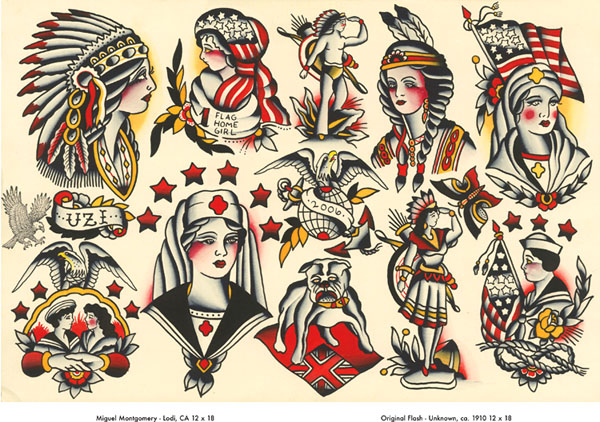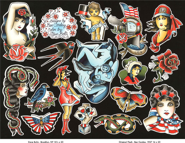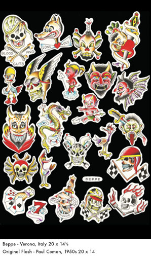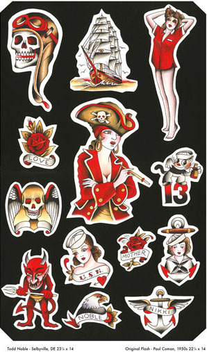 | What started as a large-scale painting project conceived by tattoo artists, Steve Boltz and Bert Krak, has evolved into a must-have, highly collectable hardbound book from Revenant Publishing. Revisited: A Tribute to Flash from the Past features modern day renditions of classic flash sheets originally presented in Don Ed Hardy’s Flash from the Past. Over 90 contemporary tattoo artists contributed flash sheets derived from and inspired by these classic sheets. Asked to stay relatively true to the look and content of the original sheets, these artists used modern painting methods to add their interpretations, giving their assigned sheets new life. The outcome is a book filled with powerful, timeless tattoo images with a modern day twist. |